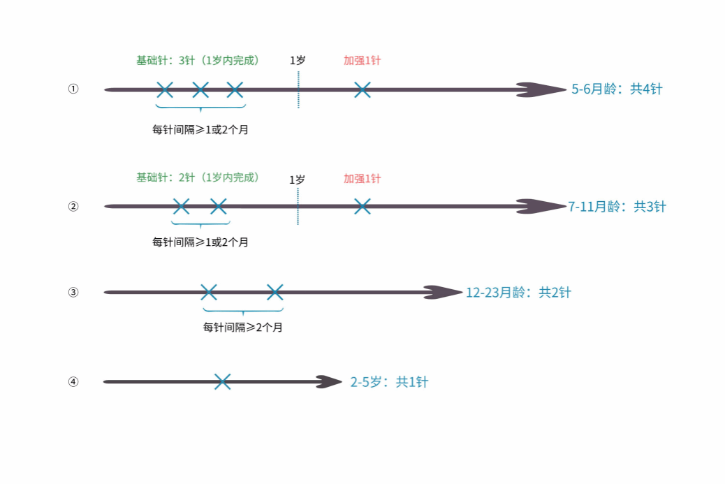 1.1-12岁儿童:接种2剂次,12-24月龄接种第1剂,4-6岁接种第2剂。未完成接种的目标儿童,应尽快补齐,接种间隔不少于3个月。